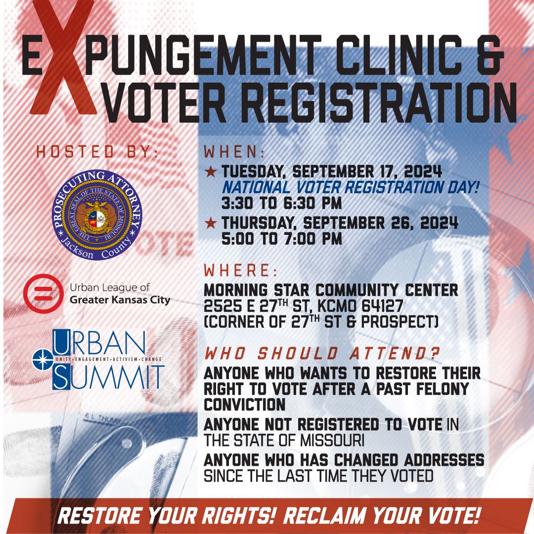 The Expungement Clinic and Voter Registration effort are hosted by the Jackson County Prosecutor’s Office, the Urban League of Greater Kansas City and Urban Summit.